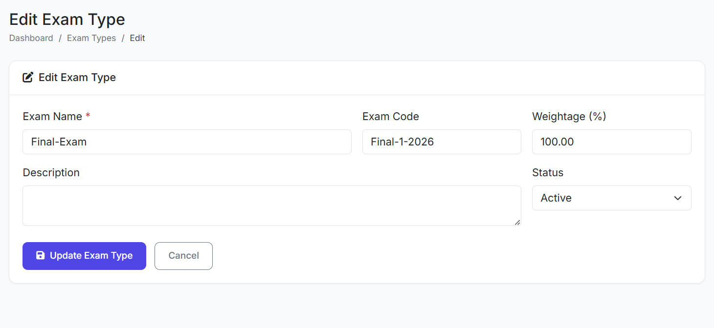The Exam Types module provides the foundational structure for organizing assessments, enabling accurate weighted grading and clear academic reporting.