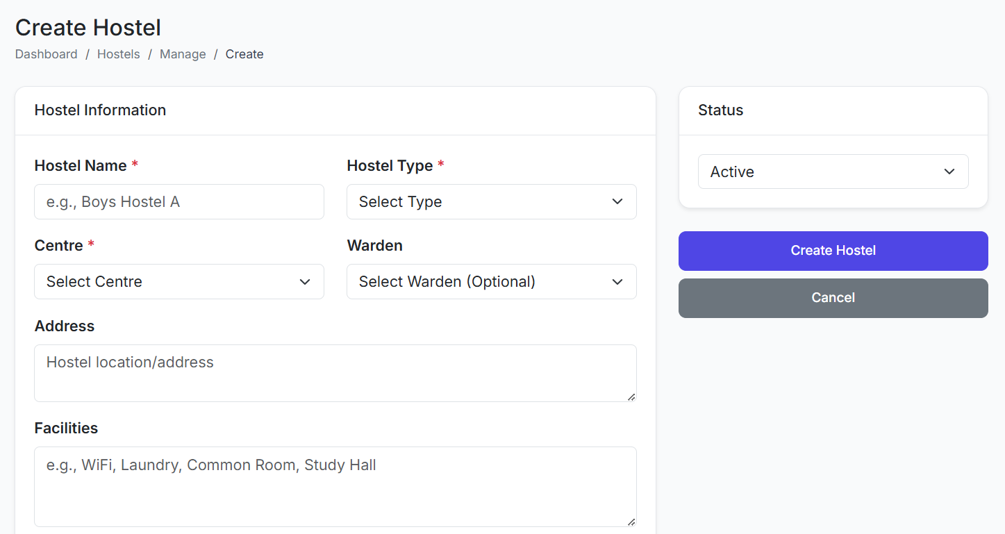 • Accurate Type: Correctly classify hostels as Boys, Girls, or Mixed to ensure proper student allocation filters later.