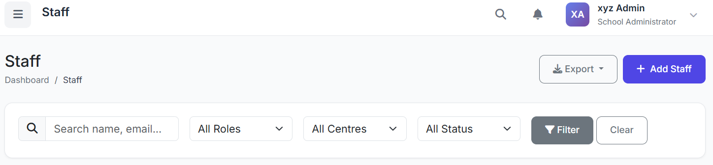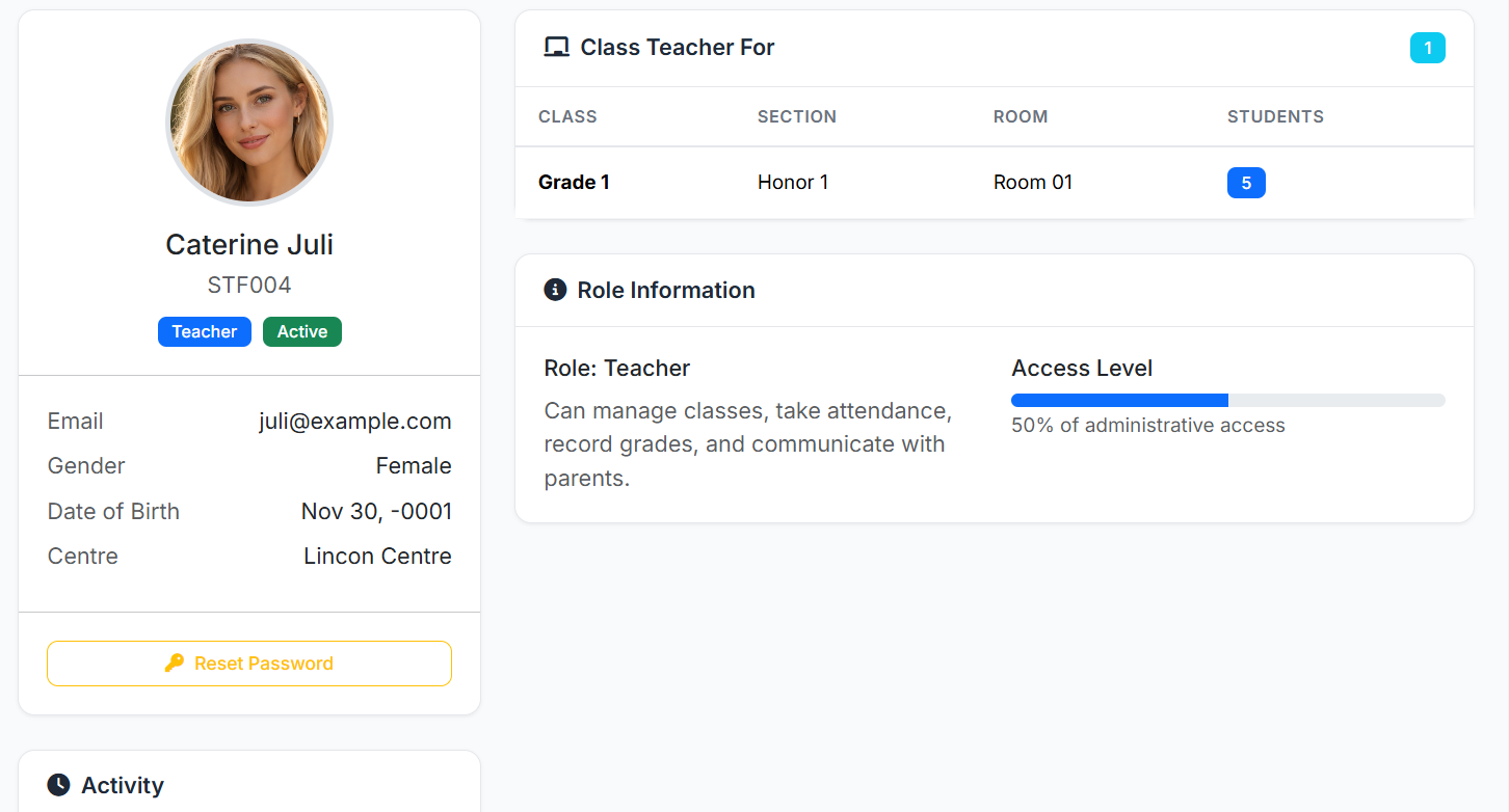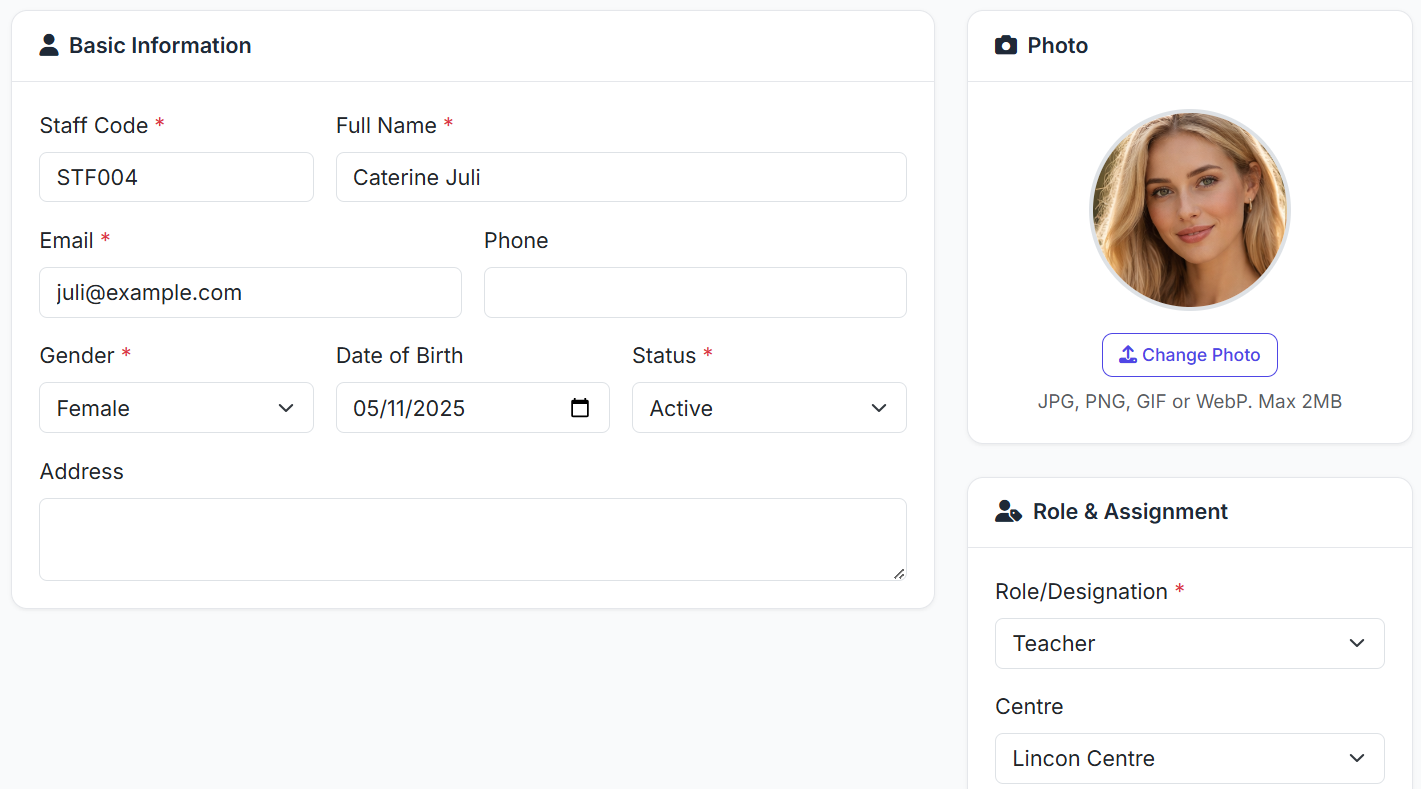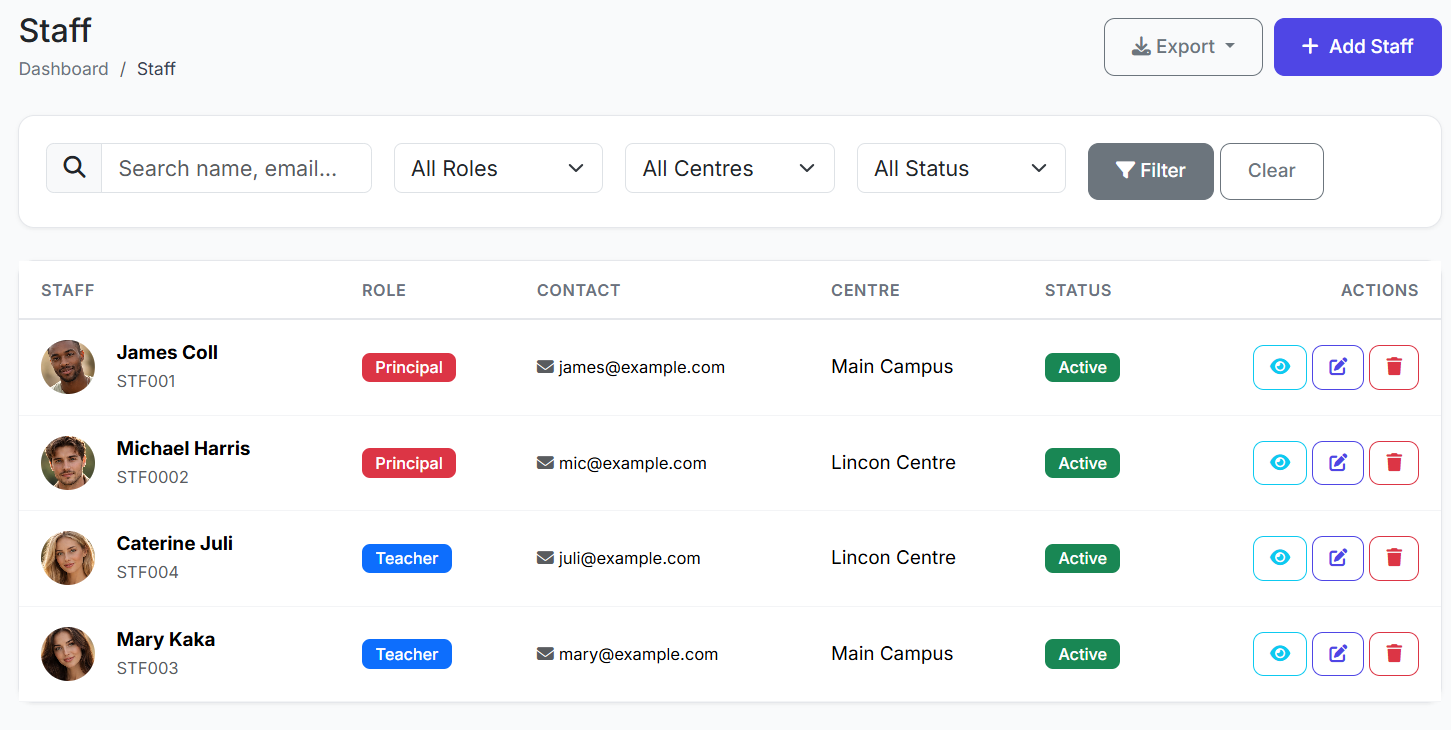 The Staff Module is the central hub for managing detailed records of all employees—including teachers, administrators, and support staff. It stores personal details, qualifications, employment history, and links to system user accounts.