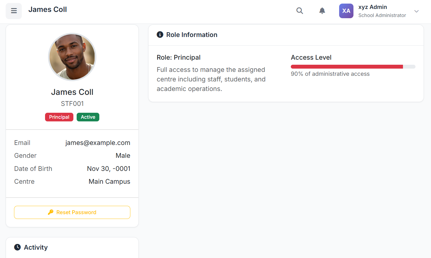 To view full details: Click the staff name or the View action button. The profile includes: