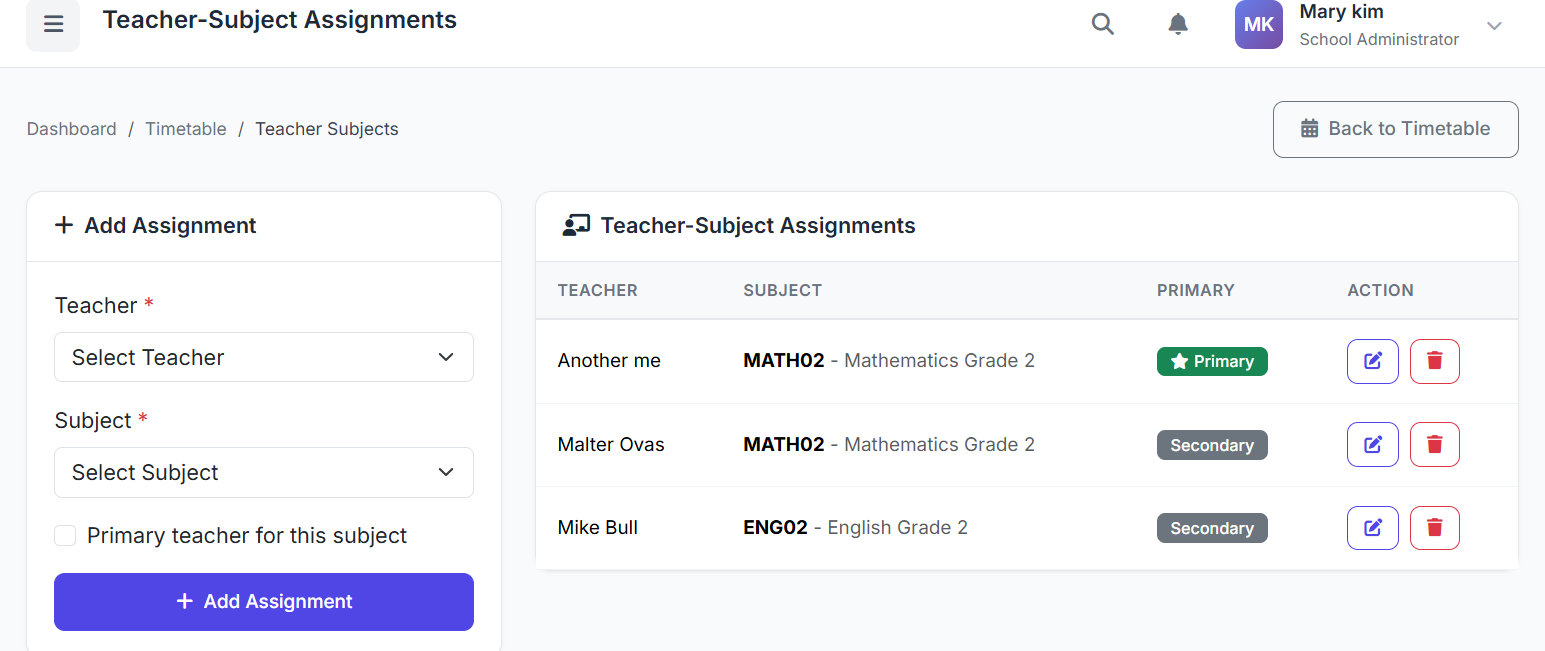 β οΈ Important: Deleting an assignment will remove the teacher from any timetable slot for that class and subject. Ensure timetables are updated accordingly.