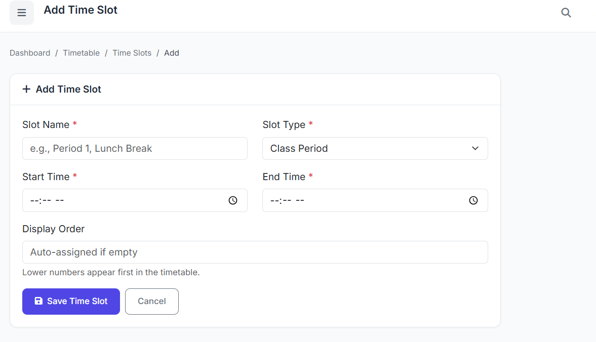 The Time Slots module defines the building blocks of the school day. It specifies the start time, end time, and purpose (e.g., Class, Break, Lunch) for each period. This configuration is the essential first step before creating any class timetables.