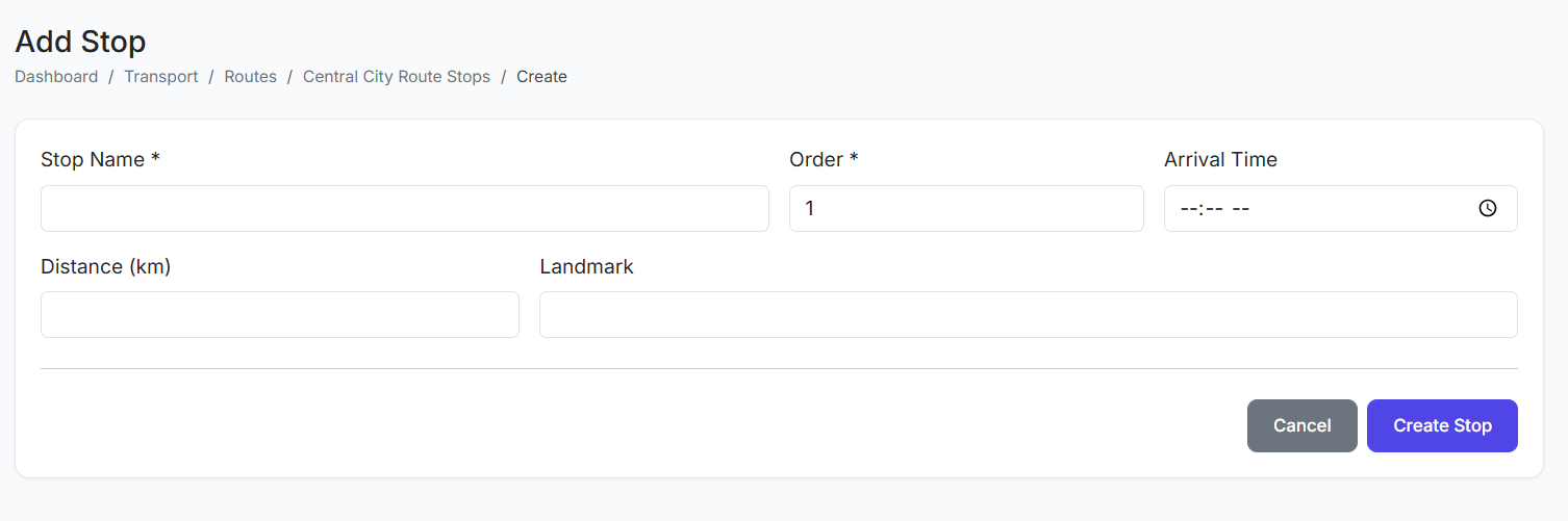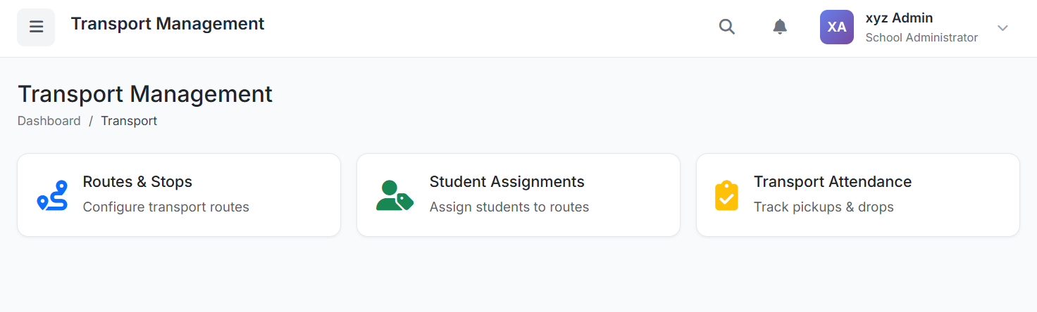 The Transport Management module centralizes all school transportation logistics. It enables administrators to define bus routes, manage pickup/drop-off points, assign students and vehicles, track daily attendance, and generate operational reports.